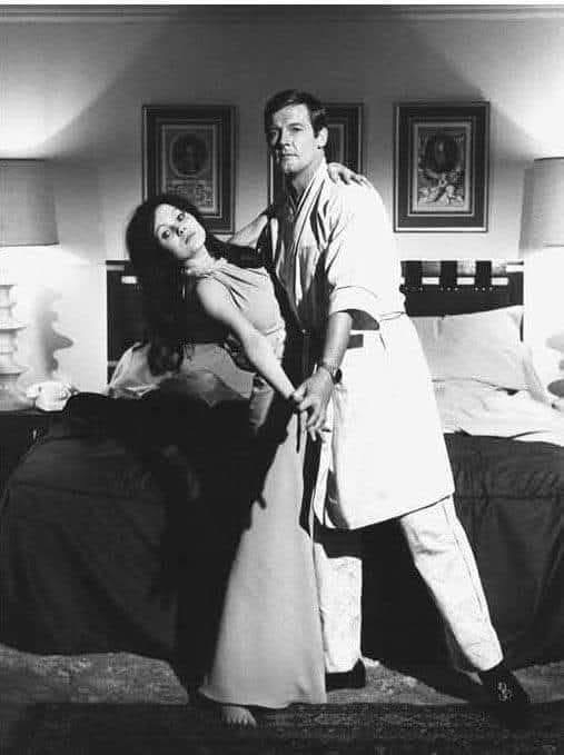 Esta foto se tomó durante el final del rodaje de la película de 1976 "Gritar al diablo", en la cual el personaje de Roger Moore se casa con la hija del personaje de Lee Marvin. La broma es que es Luisa Mattioli, la entonces esposa de Roger, quien está tomando una foto de su marido "casándose" con otra.