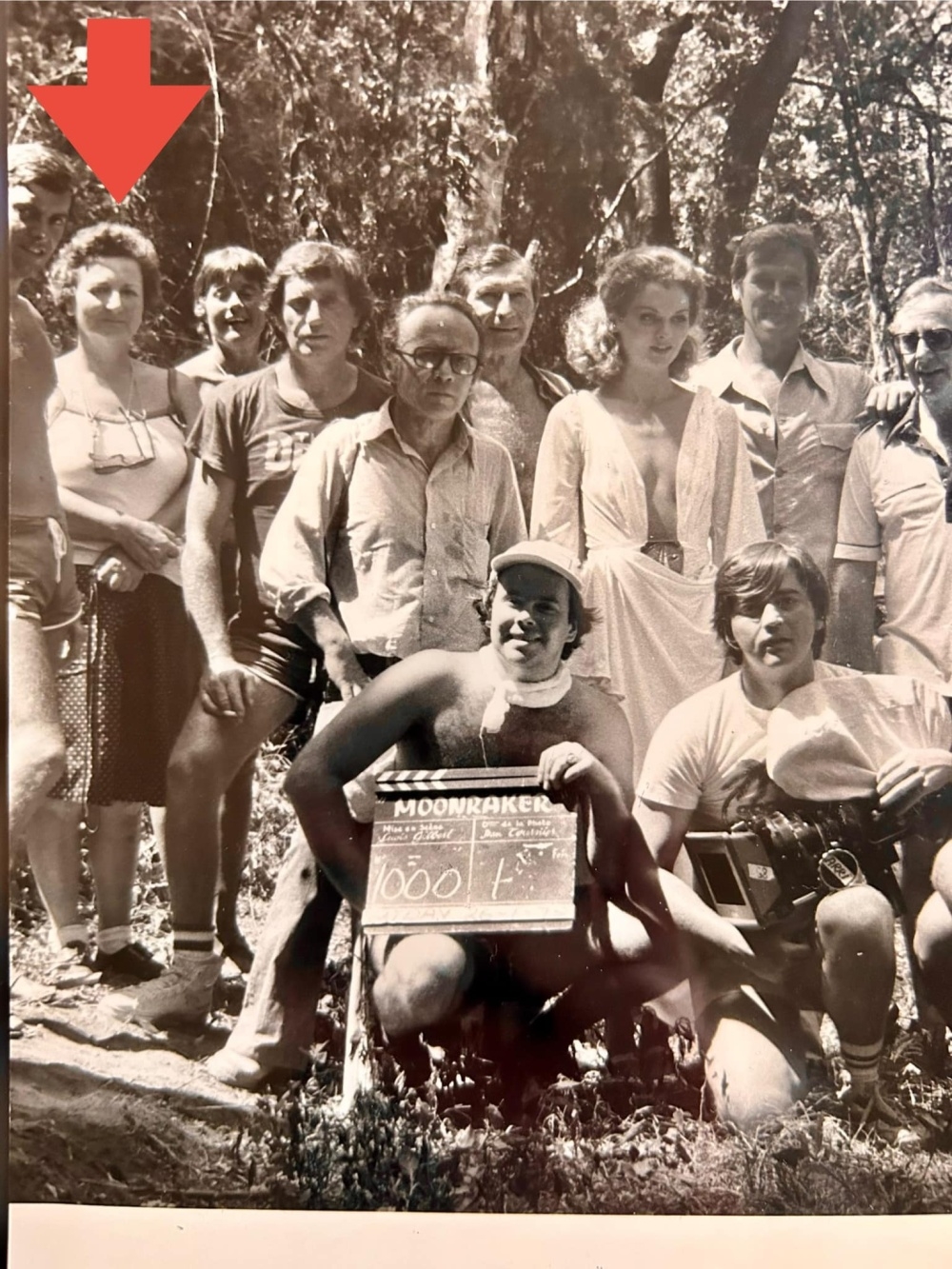Claqueta de "Moonraker": como se ve es una foto de familia por la toma número 1000. La señora señalada por la flecha es Elaine Schreyeck, supervisora de continuidad. Se la puede ver en algunos de los making-of de los DVDs, por ejemplo en el de "Diamantes para la eternidad".